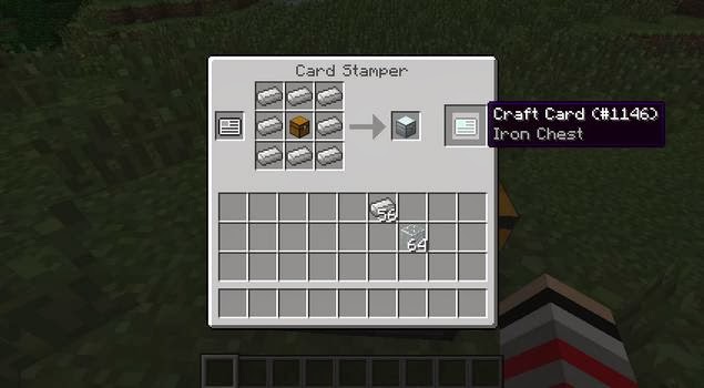 Craft cards is a very simple mod that adds simple items called Craft Cards. By themselves, they aren’t very special. However, when used on the handy Card Stamper, you can encode recipes onto them. Once a recipe is encoded, just have the right materials in your inventory and right click with the card in hand. It will instantly craft the item using the items in your inventory without the need of a work bench.
